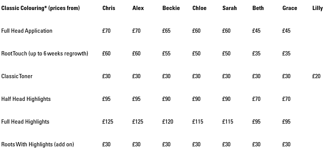 CLASSIC COLOURING* (prices from) | Chris | Alex | Beckie | Chloe | Sarah | Beth | Grace | Lilly |