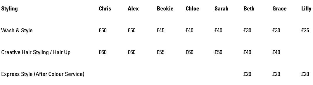 Wash & Style | £50 | £50 | £45 | £40 | £40 | £30 | £30 | £25 |