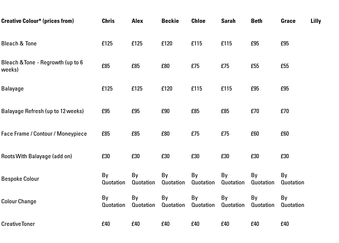 CREATIVE COLOUR* (prices from) | Chris | Alex | Beckie | Chloe | Sarah | Beth | Grace | Lilly |