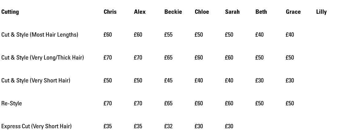 Cut & Style (Very Short Hair) | £50 | £50 | £45 | £40 | £40 | £30 | £30 | |
